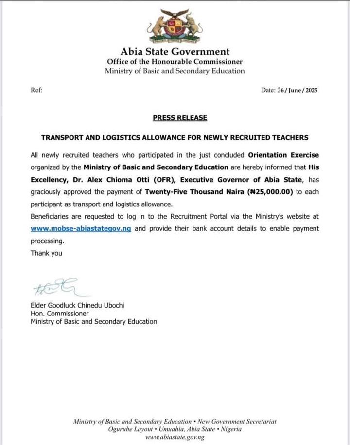 The Abia State Government has provided a N25,000 allowance for newly recruited teachers as transport and logistics allowance pending when they will be paid their first salary.