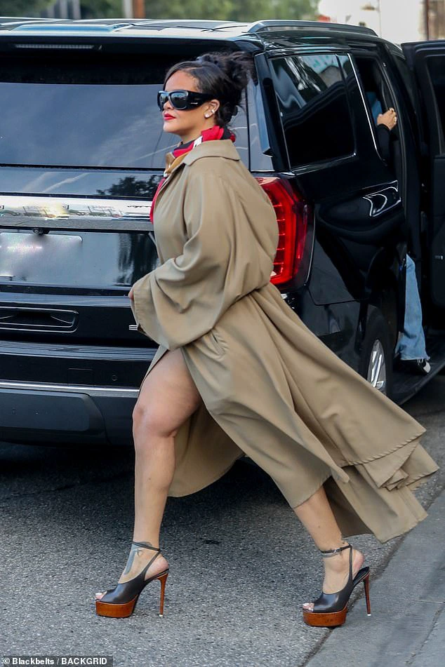 The singer was seen in a long dark beige trench coat and seemingly nothing underneath but perhaps her Savage X Fenty lingerie.