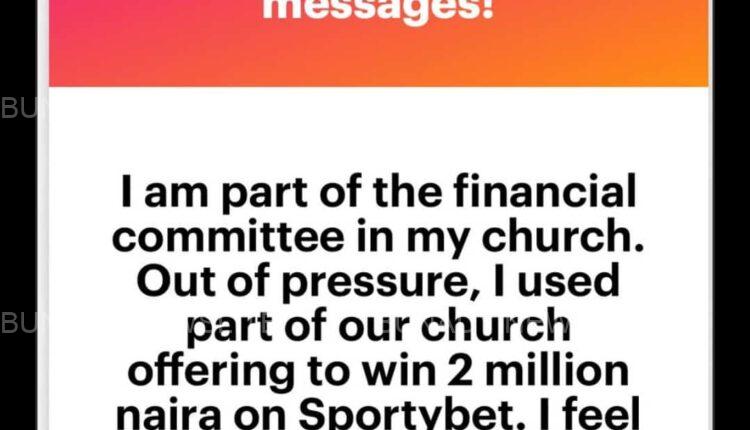 His anonymous confession reads: “I am part of the financial committee in my church. Out of pressure, I used part of our church offering to win 2 million naira on Sportybet. I feel guilty about it because it’s God money. Now I don’t know if I should return everything or just relocate to another state and change my number.”*