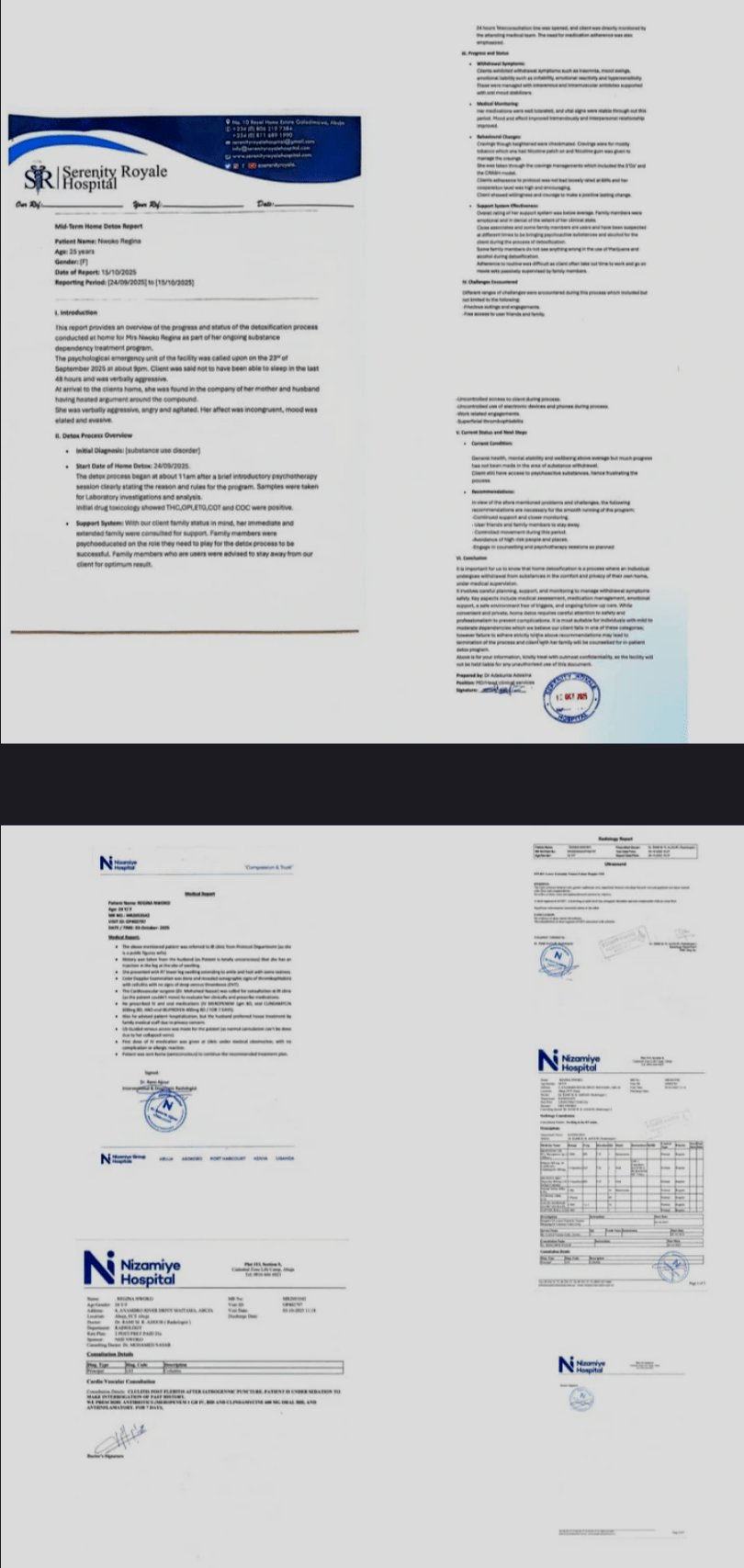 The report, issued by Serenity Royale Hospital in Abuja and signed by its Managing Director/Head of Clinical Services, Dr. Adekunle Adesina, covers her detoxification programme from September 9 to October 15, 2025. It indicates that Daniels tested positive for multiple psychoactive substances, including marijuana, cocaine, morphine, opiates and high levels of alcohol.