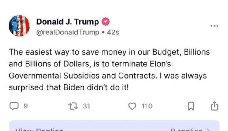 “The easiest way to save money in our Budget, Billions and Billions of Dollars, is to terminate Elon’s Governmental Subsidies and Contracts,” Mr. Trump wrote on Truth Social.