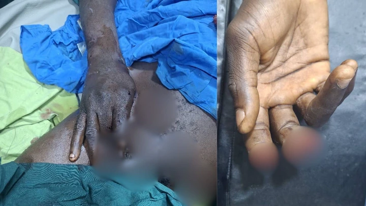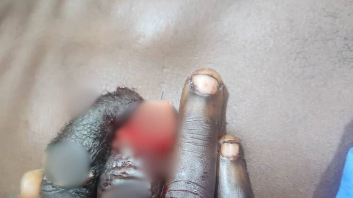 In gory videos and pictures obtained by SaharaReporters, Ebenezer’s two fingers were seen completely chopped off, while parts of his flesh were reportedly cut to support his damaged hand during treatment.
