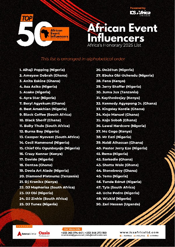Curated by Impact Concept and Solutions Limited (ICS Africa) in partnership with Avance Media, the 2025 list celebrates excellence across six categories: Event Executives, DJs, Digital Media Publishers, MCs/Hosts, Music Performers, and Digital Event Influencers.