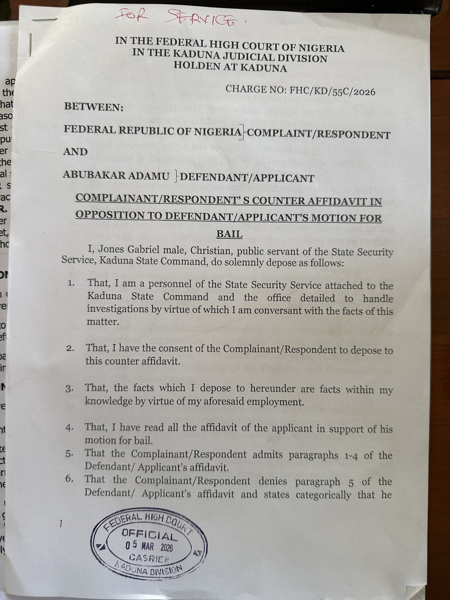 The claim was made in a counter-affidavit filed by the DSS before the Federal High Court of Nigeria sitting in Kaduna in the case between the Federal Republic of Nigeria and Abubakar Adamu, a social media user whose X account is identified as @AbbakarAffan.