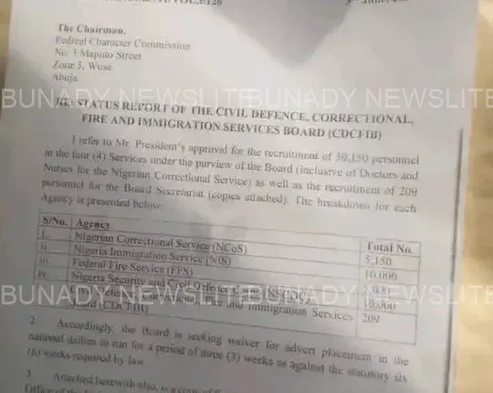 Dated June 3, 2025, and signed by Maj. Gen. (Rtd.) AM Jibril, the Secretary of CDCFIB, the memo claims that President Bola Ahmed Tinubu has given the go-ahead for a large-scale recruitment exercise across four major paramilitary agencies.