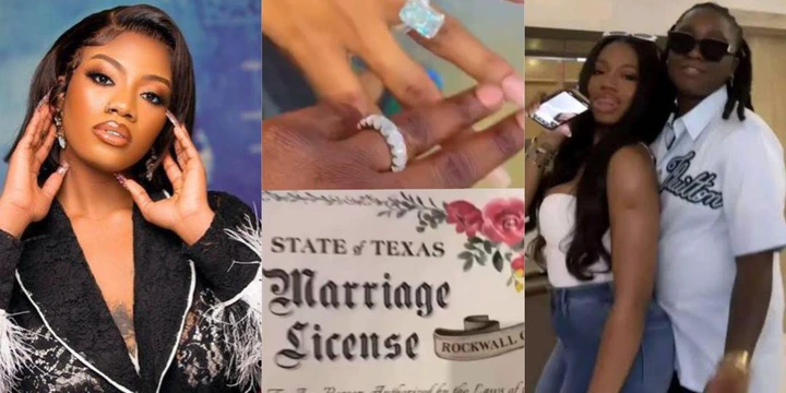 Former BBNaija star Angel Smith has sparked massive reactions online after a video emerged showing her and her girlfriend flaunting what appears to be a wedding ring and a marriage certificate.