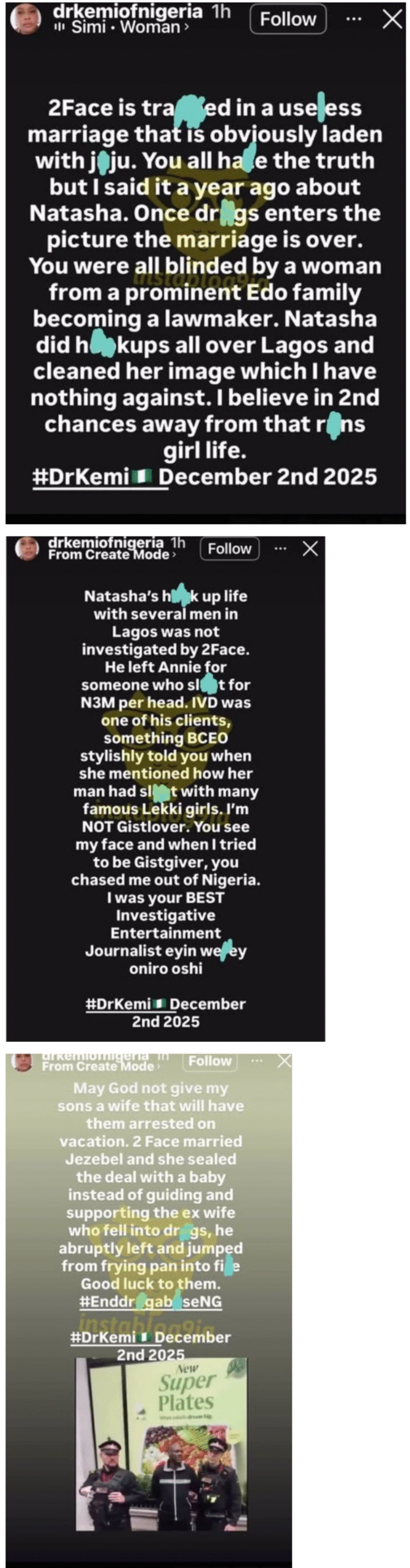 The journalist accused Natasha of having had a “h[oo]k up life with several men in Lagos” that 2Baba allegedly failed to investigate. Olunloyo specifically claimed that 2Baba “left Annie for someone who sl[e]pt for N3M per head” and alleged that the singer married a “Jezebel”.