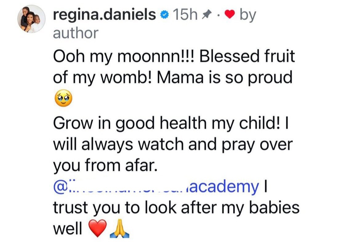 Regina took to the comment section to write: “Ooh my moonnn!!! Blessed fruit of my womb! Mama is so proud.