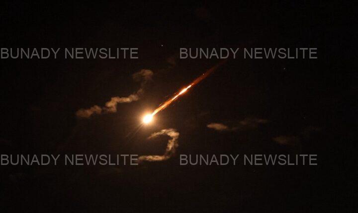 FILE: Debris of a missile fired from Iran toward Israel leaves a trail in the night sky over Hebron in the occupies-West Bank after being intercepted on June 13, 2025.