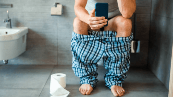 Close up of gentleman sitting on toilet bowl and holding mobile phone stock photo. Doctors are now warning people to rethink how they use the toilet. While many individuals sit for long periods scrolling through their phones, this habit may secretly harm their health. Sitting too long in the bathroom increases pressure on the lower body and can lead to several problems that develop slowly over time.