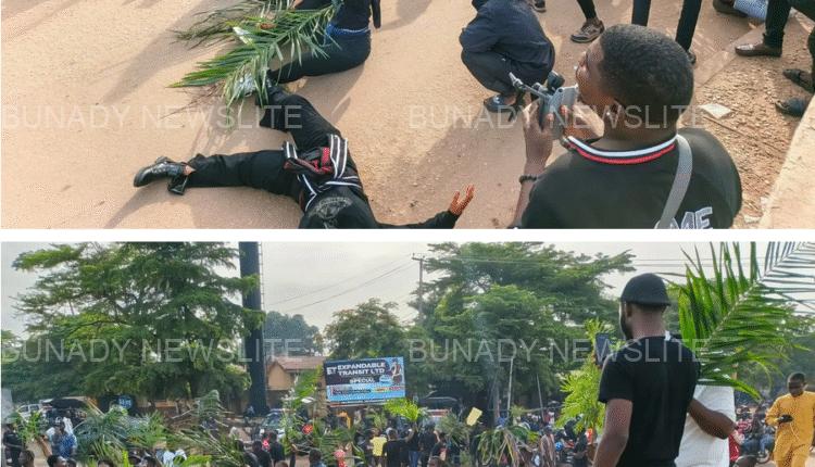 The demonstrators, dressed in black attires and carrying palm fronds and placards with various inscriptions, barricaded the ever-busy road, disrupting vehicular movement and demanding immediate action to end the bloodshed.