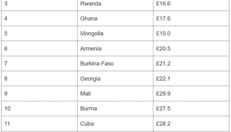 The Southeast Asian country of Laos took the number one spot, with just £12.3 (R305) needed per person per day.