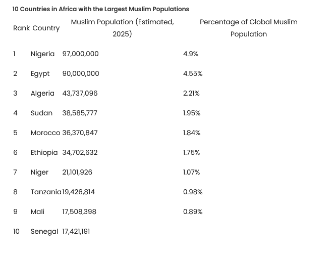 The table below highlights the top ten African countries with the largest Muslim populations as of 2025, providing insight into where Islam’s presence is most concentrated and how these nations contribute to the global growth and distribution of the faith.