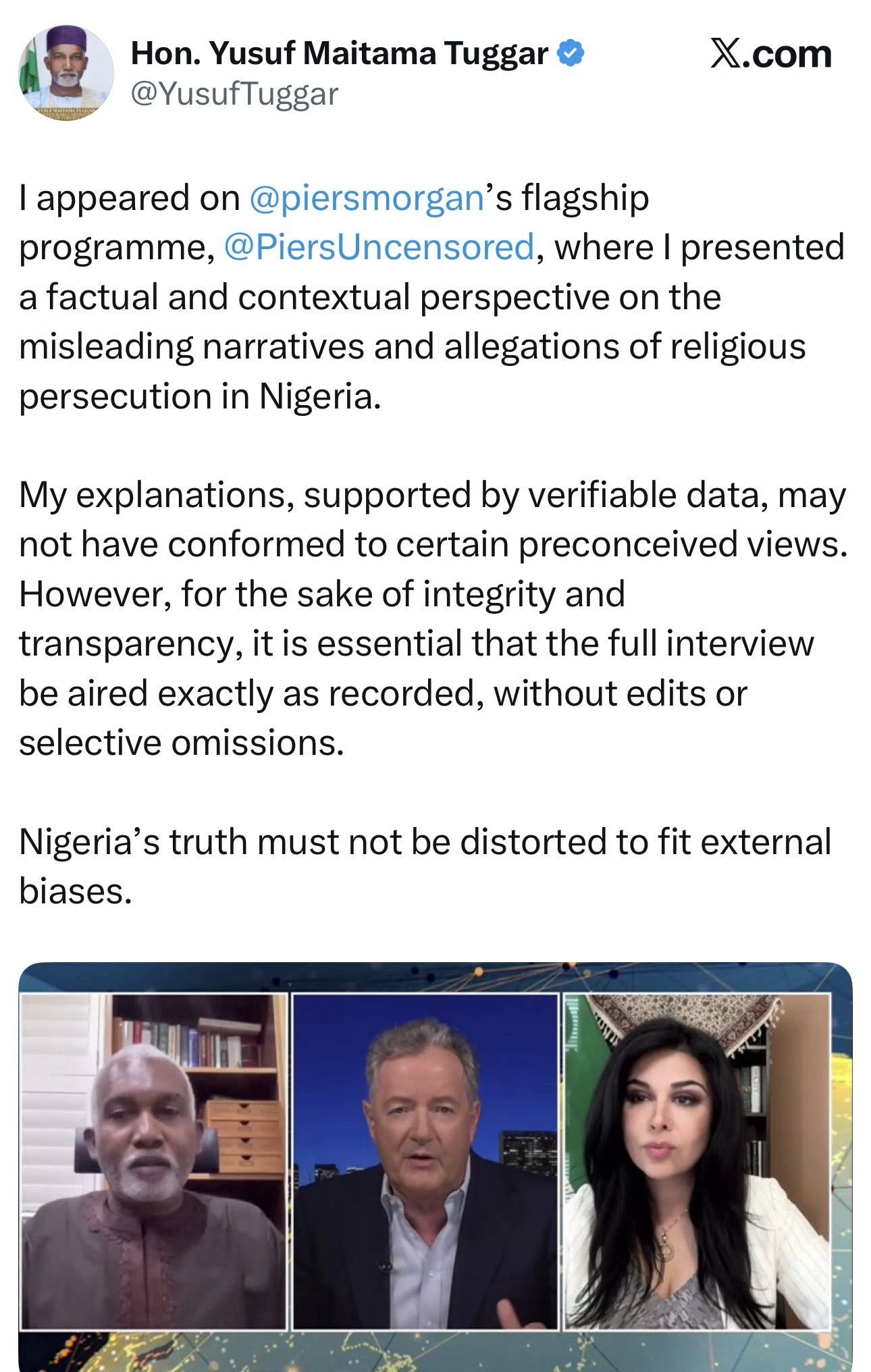 Tuggar, in his original post, insisted that he had given a factual and contextual explanation of what he called misleading narratives about religious persecution in Nigeria. He said his responses were backed by verifiable data but may not have aligned with what he described as preconceived expectations. The minister demanded that his full interview be aired exactly as recorded, without edits or selective omissions, stressing that Nigeria’s truth must not be distorted to fit external biases.
