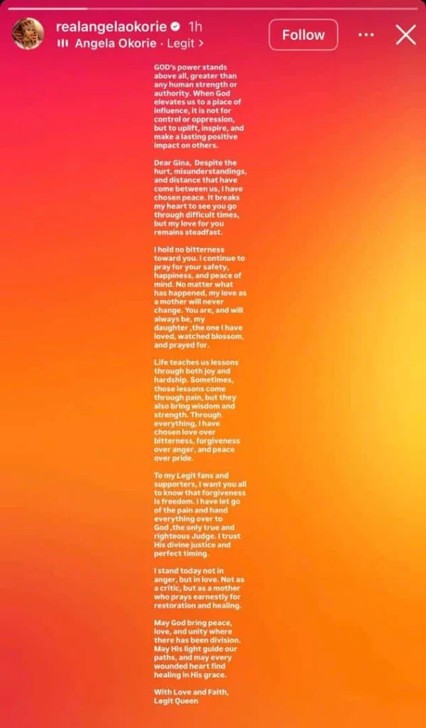 In a touching note shared via her Instagram story, Angela emphasized the importance of choosing peace, forgiveness, and love despite any past misunderstandings.